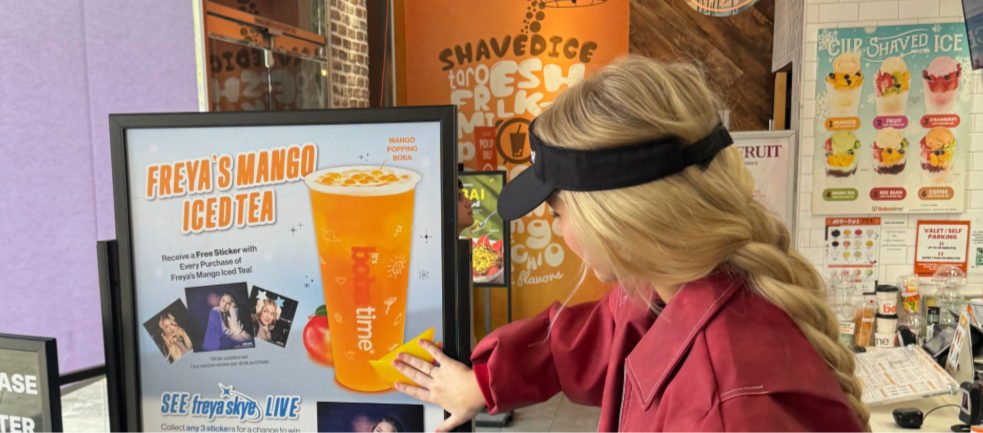 A fan-focused activation celebrating Freya Skye as both an emerging artist and an It’s Boba Time superfan. The concept paired the artist’s favorite drink with collectible elements and interactive social moments, including a social contest offering fans the chance to win tickets to her Los Angeles and Anaheim tour stops.