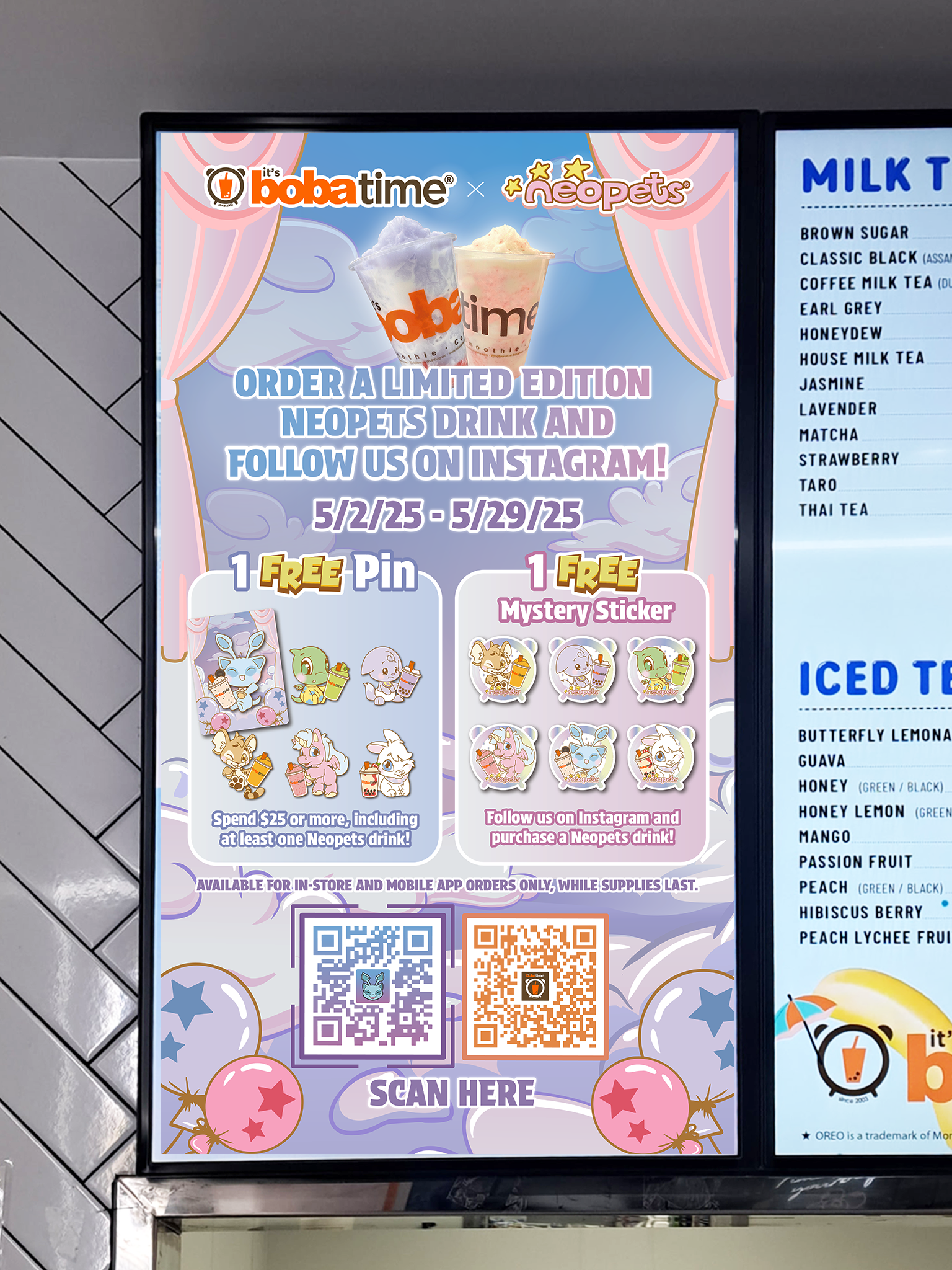 I led creative direction and campaign production for a limited-time collaboration between It’s Boba Time and Neopets, bringing the nostalgic world of Neopia into a large-scale retail activation. The campaign transformed store environments into immersive brand experiences through themed drinks, collectible merchandise, and playful in-store visuals. I directed execution across digital, retail, and social touchpoints while coordinating with global partners to ensure a cohesive launch across all participating locations.